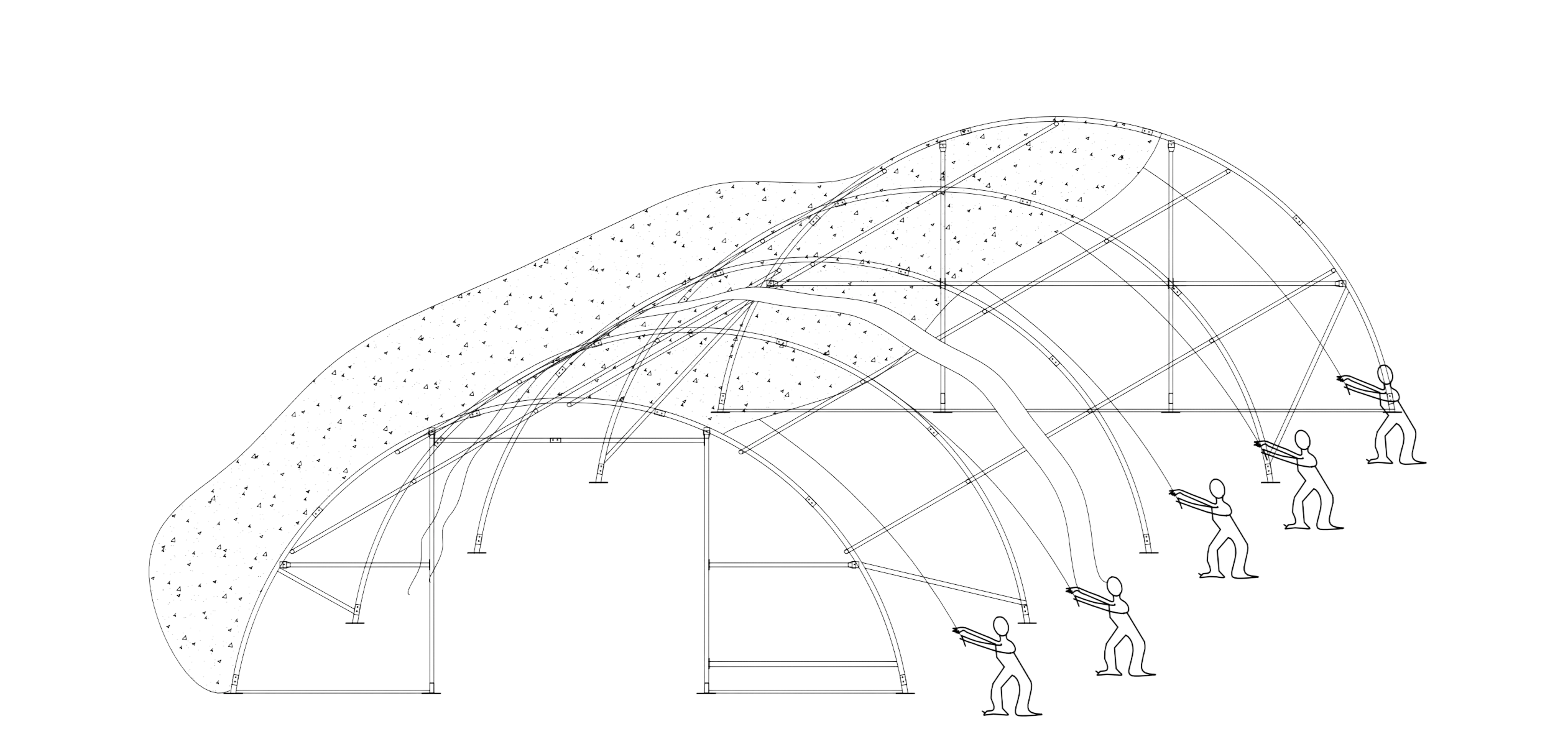 The arched roof consists of vertical arches that are reinforced by horizontally running steel tubes and firmly connected to each other by bolted joints. This roof shape prevents water accumulation and build-up even over longer periods of time, as rain and dirt can run off evenly.