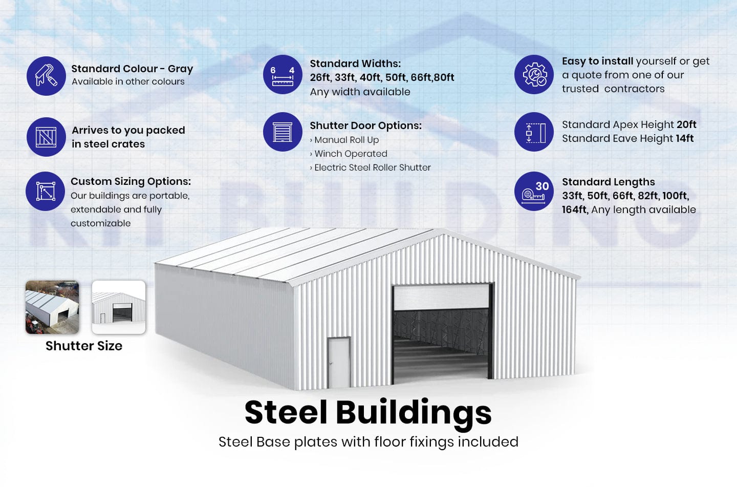 Yes, Kit Buildings’ structures are customizable. You can use our Building Configurator or contact us directly to specify your requirements. You have the flexibility to adjust the width, length, and height, choose the position of shutters and doors, select colours, and decide on the type of insulation to suit your needs for your steel framed building.